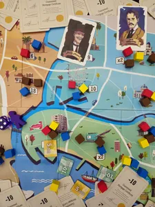 Each round, colored cubes are auctioned off based on a dice roll. Win the bid and place your cubes in strategic areas on the game board—once an area holds seven cubes, it’s locked, and the player with the most cubes claims ownership. But beware: ties are ignored, so the lone cube may clinch the win! Manage your limited funds, decide when to take loans, and balance your investments. Loans provide extra cash but must be repaid at the end, reducing your final wealth.