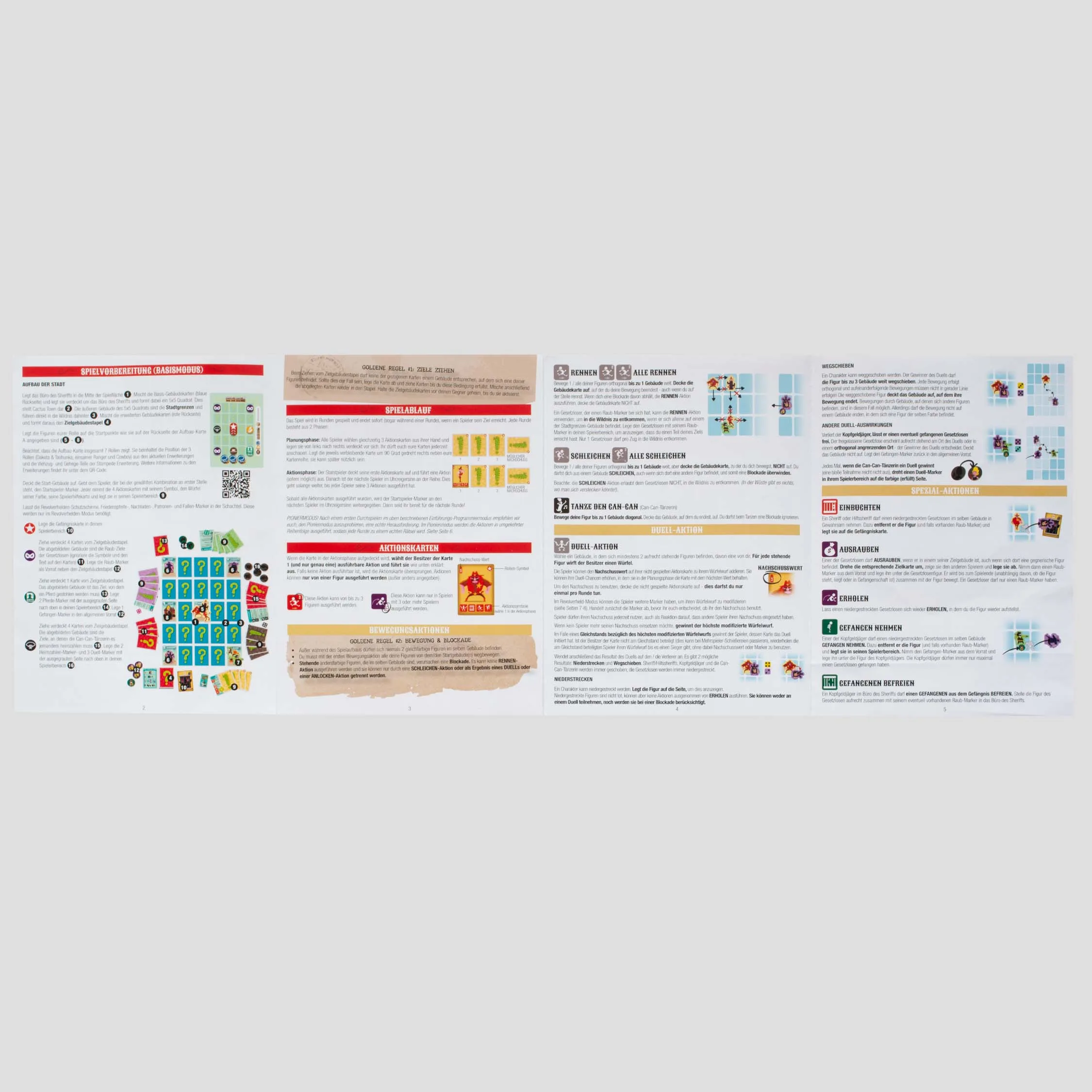 The gameplay is driven by programming 3 out of 4 available actions in reverse order, meaning the last action card selected is the first executed—leading to both clever strategies and hilarious mishaps. The 5×5 grid of face-down building cards creates a dynamic and ever-changing town layout, keeping players guessing and adapting.