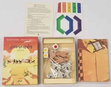 Each player guides a mule along the track, but men of unique colors join the race and add extra twists. Roll three color dice every turn—move tokens forward, backward, or dash ahead based on the results. Smart players can choose to keep one or two dice intact for their next roll, unlocking a subtle catch-up mechanic and strategic movement.